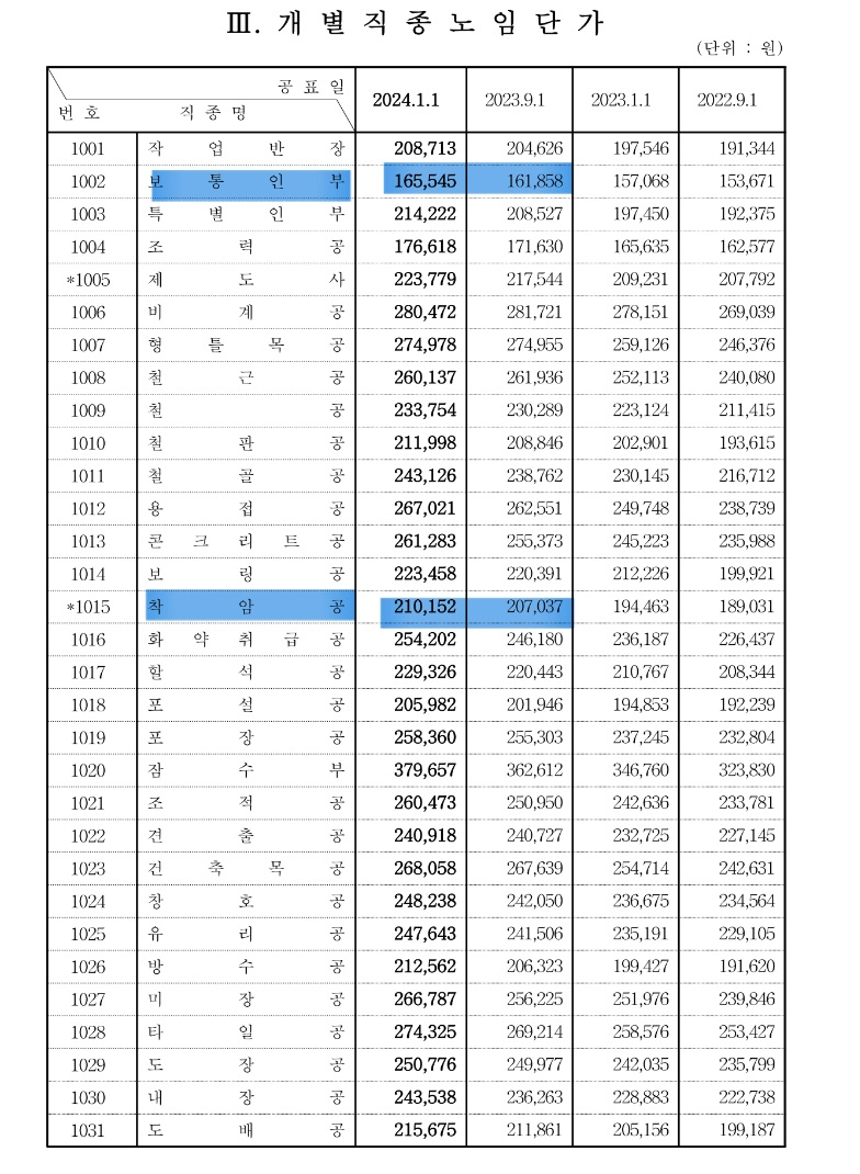 건설업 임금실태 조사 보고서, 이름은 좀 뭔가 무서울 거 같은데 우리는 '노임단가' 보려고 하는거다. 쉽게 말해 조적공, 목공 등 특정 일을 하는 인부들의 몸값을 알려주는 표다.