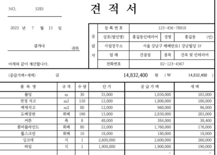 흔히들 말하는 발주청(공공기관, 지자체, 정부에서 지정한 발주업체 등)에서 근무하게 되면 많이 받게 되는 것이 바로 견적서다. 아래와 같은 간단한 견적서부터 시작해서, 대규모 건설공사의 경우에는 내역서를 일일히 확인해야 한다. 내역서는 보통 엑셀파일로 정리가 되어있다.