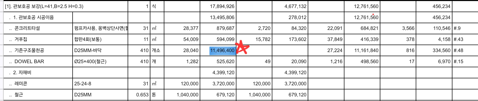 일위대가를 보면 금액이 가장 많이 나온 '구조물 천공' 부분이 어떤 품셈으로 계산이 되었는지 알 수 있다. 그러면 이제 보아야할 게 2가지다.