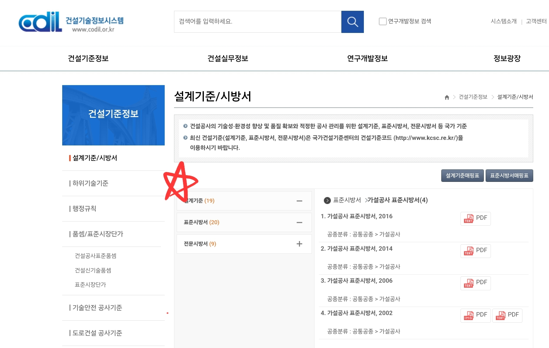 특기시방서 | 표준시방서, 전문시방서를 기본으로 하여 작성하되 공사의 특수성, 지역여건, 공사방법 등을 고려하여 기본설계 및 실시설계 도면에 구체적으로 표시할 수 없는 내용과 공사수행을 위한 시공방법 자재의 성능, 규격, 공법 등 품질관리, 안전관리, 환경관리 등에 관한 사항 기술 |