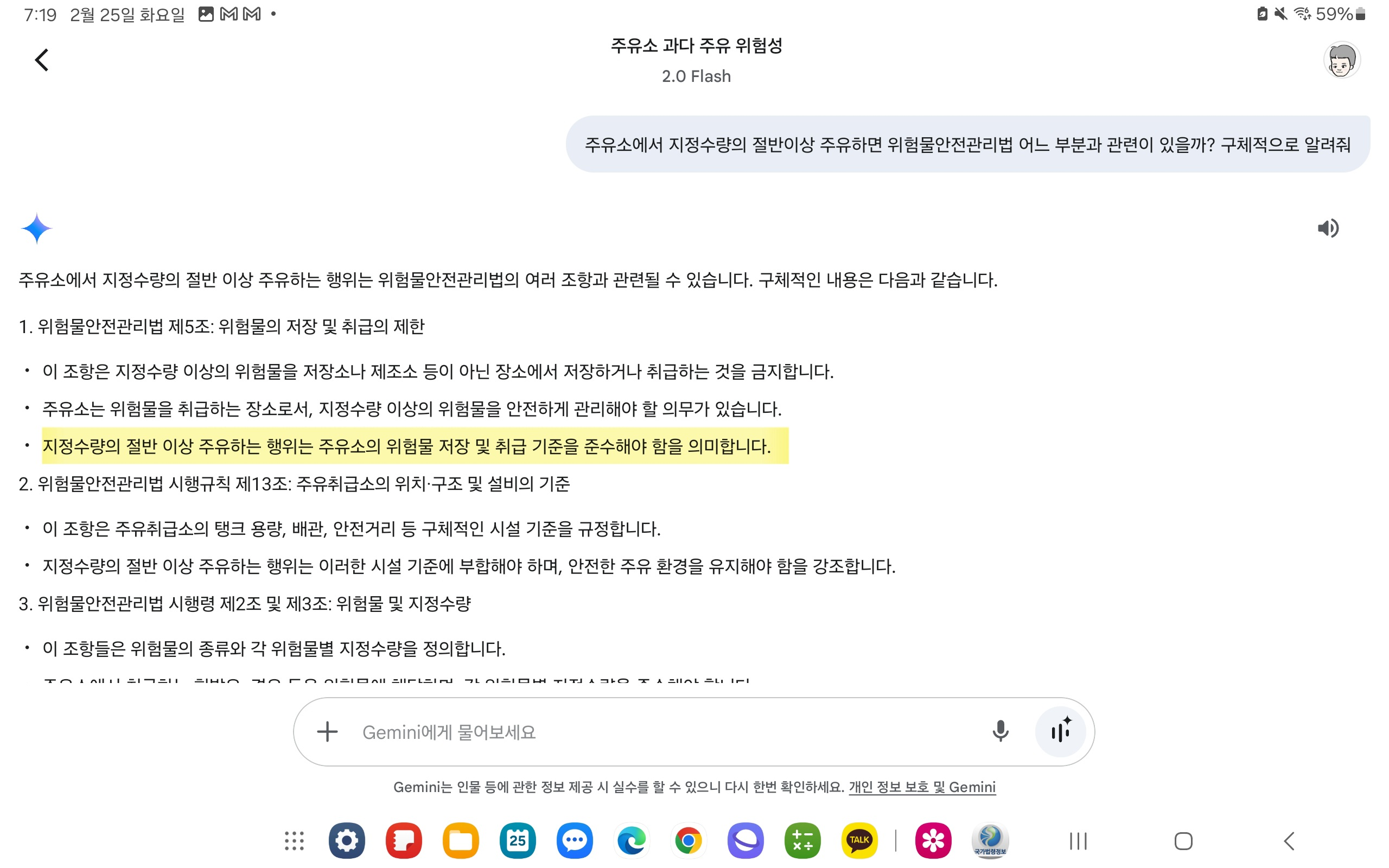 우선 AI에게 물어본 결과 '지정수량의 절반이상 주유하는 행위는 주유소의 위험물 저장 및 취급 기준을 준수해야 함' 이라고 말해주었다.
