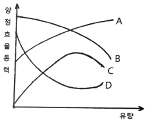 그러므로 펌프의 효율 곡선을 나타내는 것은 C 이다.