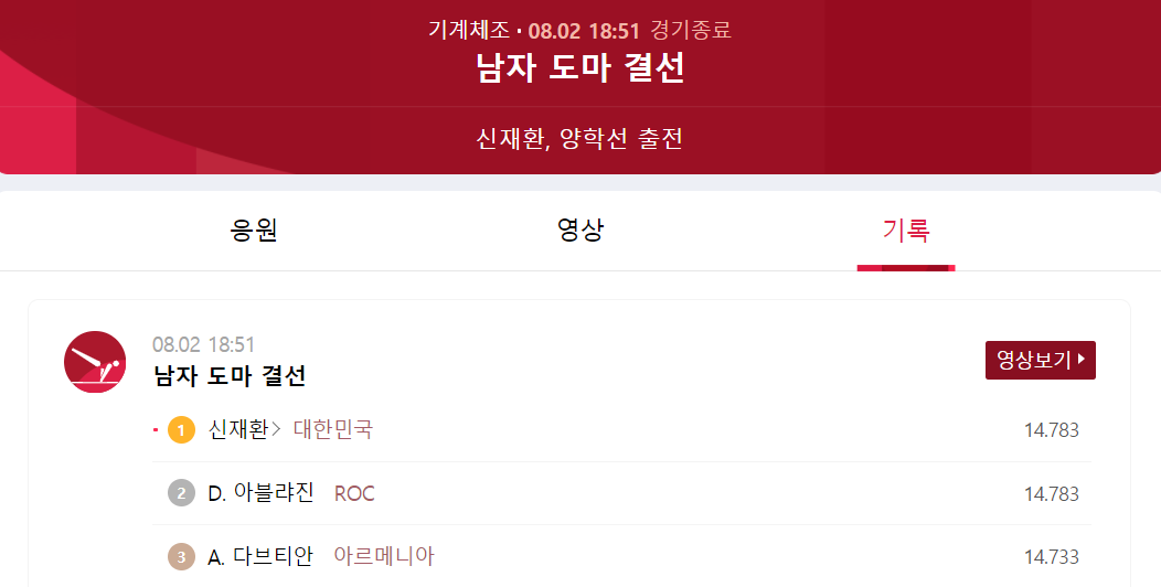 양학선 - 신재환 선수를 이어 앞으로 열릴 올림픽에서도 대한민국 체조 선수들이 준비한 만큼 실력을 뽐내고 메달이라는 값진 보상을 받기를 바랍니다.