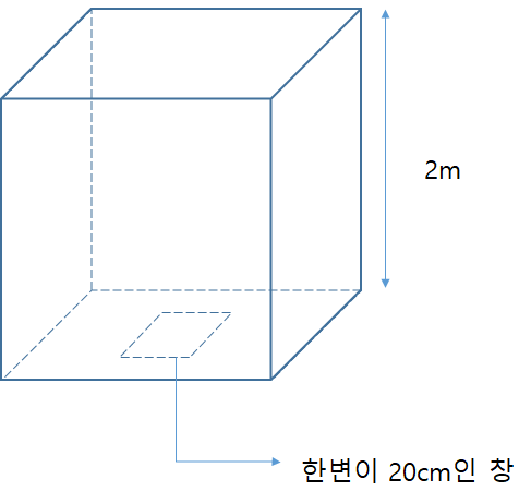 40. 2m 깊이로 물이 차있는 물 탱크 바닥에 한 변이 20cm인 정사각형 모양의 관측창이 설치되어 있다. 관측창이 물로 인하여 받는 순 힘(net force)은 몇 N인가? (단, 관측창 밖의 압력은 대기압이다.)