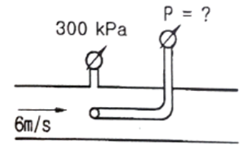 36. 유속 6m/s로 정상류의 물이 화살표 방향으로 흐르는 배관에 압력계와 피토계가 설치되어있다. 이때 압력계의 계기압력이 300 kPa이었다면 피토계의 계기압력은 약 몇 kPa인가?
