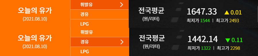 연료가격 기준은 2021.08.10 (출처: 한국석유공사 오피넷)