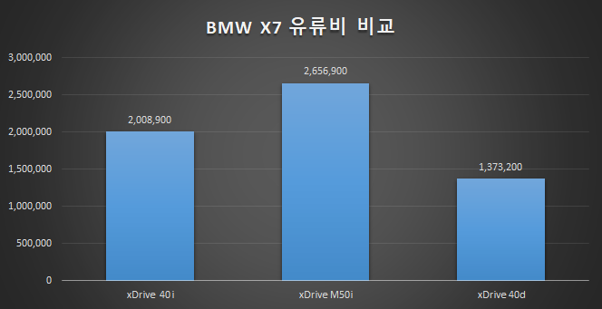 가솔린 모델의 유류비가 가장 비싸다. 특히 xDrive M50i 모델의 경우 V8엔진이 들어가기 때문에 훨씬 다이나믹한 주행이 가능한 대신 배기량이 더욱 높아서 연비가 상대적으로 나쁘다.