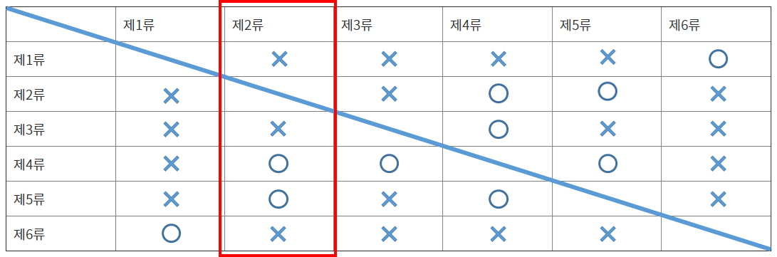 2. 가로 및 세로 축에 제1류 ~ 제6류를 적는다