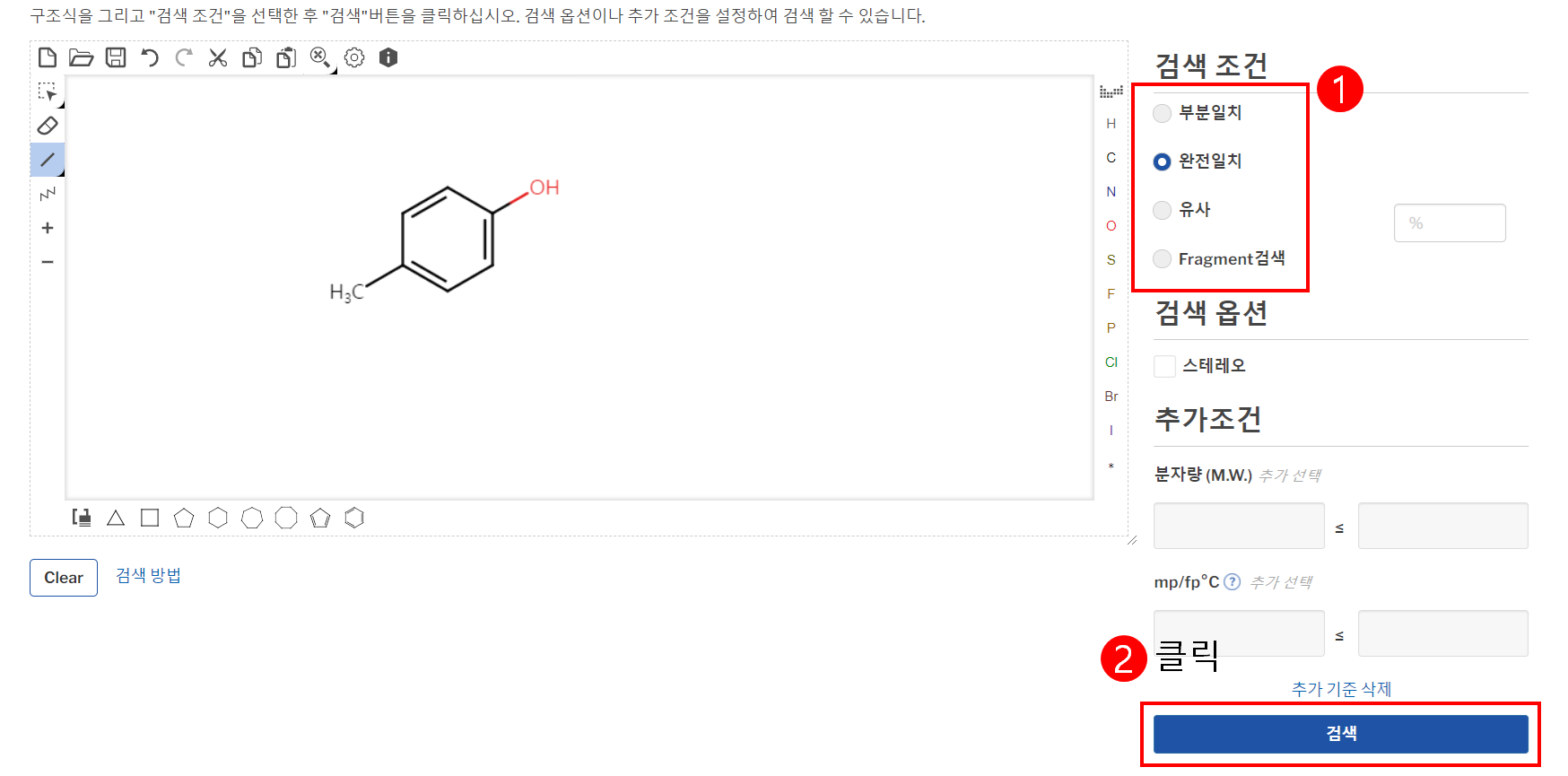 구조식 검색 구조식을 그리고 "검색 조건"을 선택한 후 "검색"버튼을 클릭하십시오. 검색 옵션이나 추가 조건을 설정하여 검색 할 수 있습니다.
