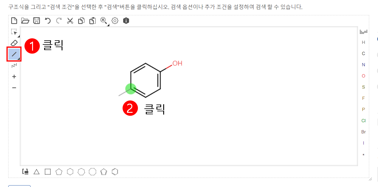 2-3. 이제 para 위치에 메틸기를 추가해주면 된다. 아까랑 동일하게 좌측의 막대기 모양 아이콘을 클릭하여 수산화기와 para 위치 지점에 클릭해주면 된다.