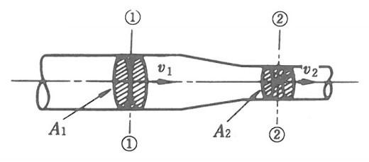 질량보존의 법칙에 의해 동일한 시간동안 1번 및 2번 지점을 흐른 유체의 질량은 같아야한다.