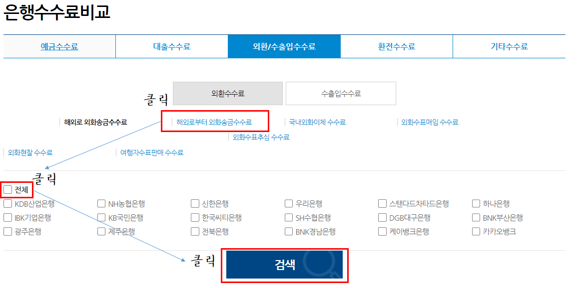 우리는 달러를 해외로 보내는 게 아닌, 달러를 해외에서 받는것이므로 '해외로부터 외화송금수수료'를 클릭합니다. 그리고 전체 은행 클릭, 검색을 누릅니다.