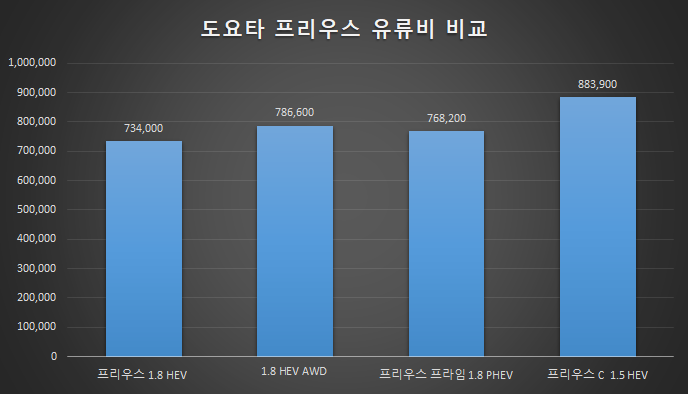 토요타 준중형 세단 프리우스의 모델별 유류비를 비교해보자. 일명 연비깡패