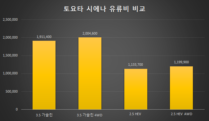 토요타 대형 RV 시에나(Sienna) 모델별 유류비를 비교해보자.