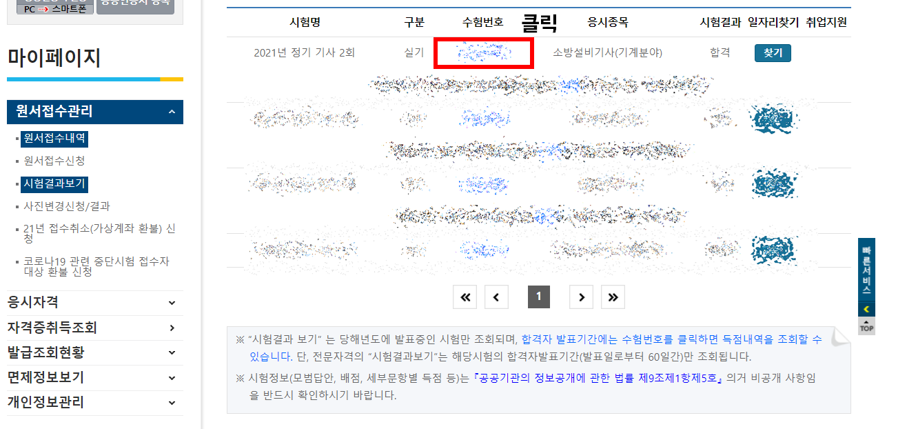 5) 그러면 본인이 응시했던 시험결과가 나타납니다. 여기서 본인이 신청하려는 자격증의 수험번호를 클릭합니다.