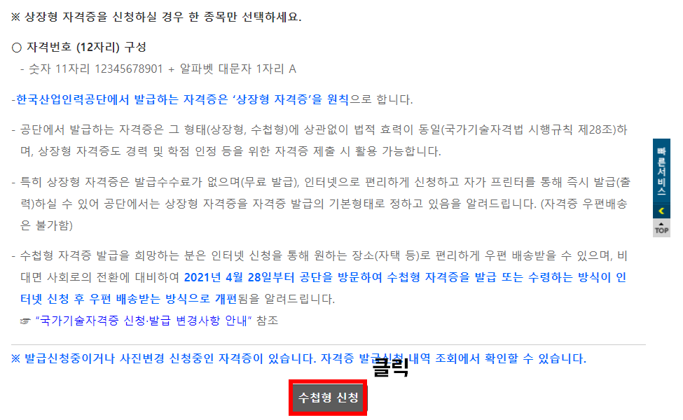화면 아래쪽에 수첩형자격증 신청하기를 클릭합니다.
