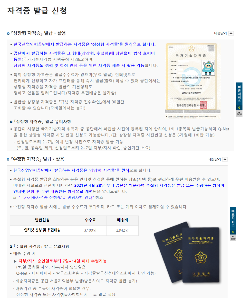 코로나로 인해 산업인력공단에 방문하여 수첩형 자격증 신청은 불가하다고 합니다. 온라인 신청해서 택배수령만 가능하다고 합니다.
