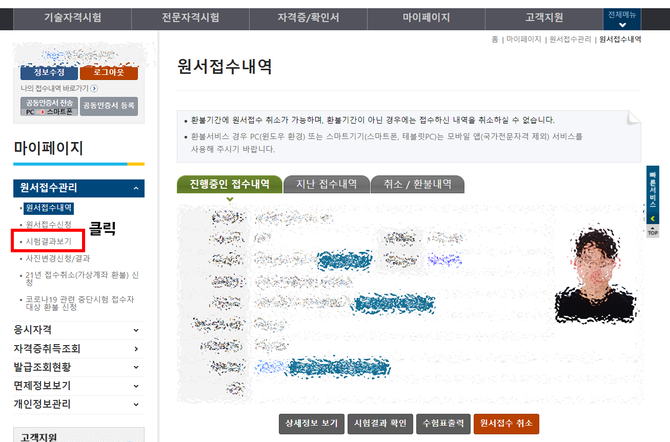 4) 로그인하면 아래와 같은 화면이 뜹니다. 시험결과보기를 클릭합니다.