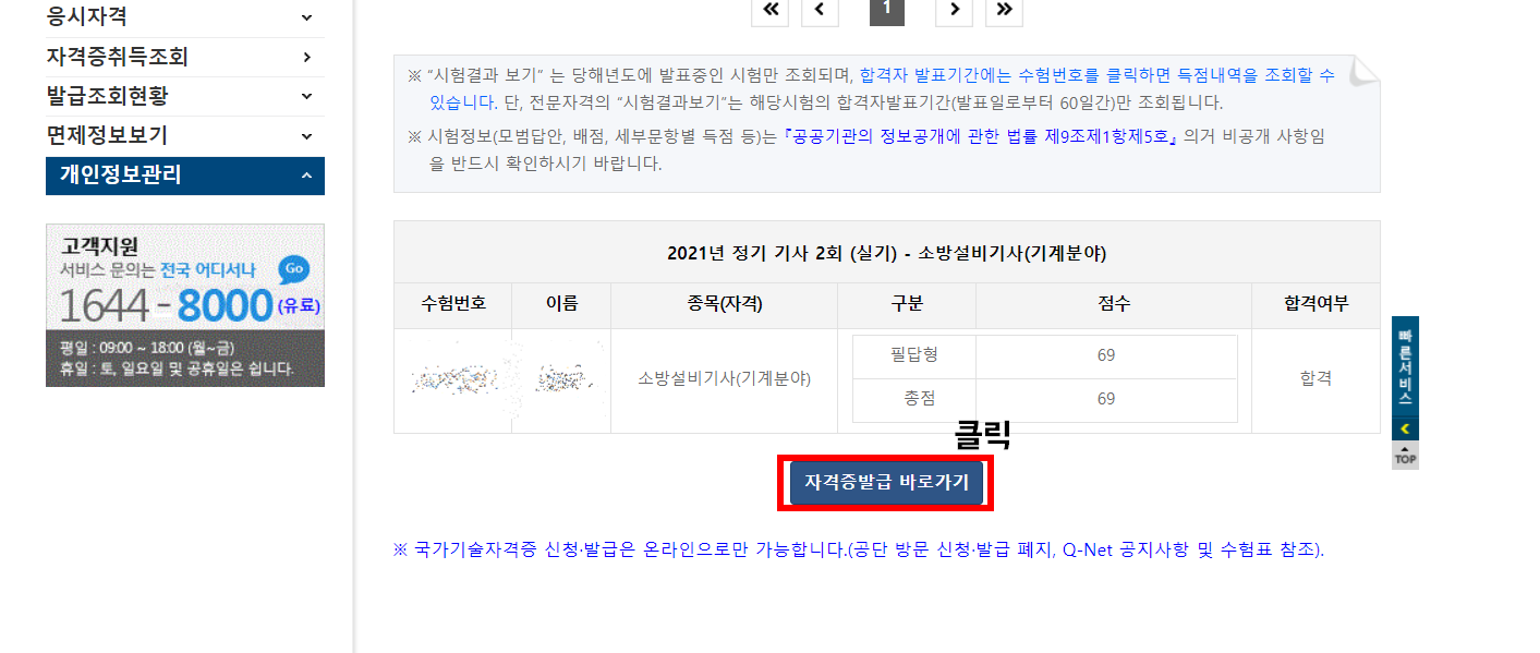 5) 그러면 본인이 응시했던 시험결과가 나타납니다. 여기서 본인이 신청하려는 자격증의 수험번호를 클릭합니다.
