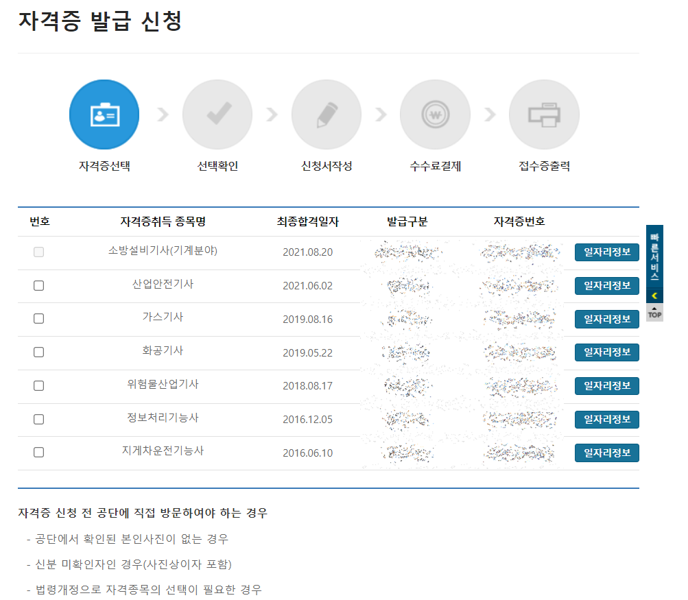 저는 최근에 소방설비기사(기계분야) 수첩형 자격증을 신청해서 중복신청이라고 뜨네요. 화공기사로 신청해보겠습니다.