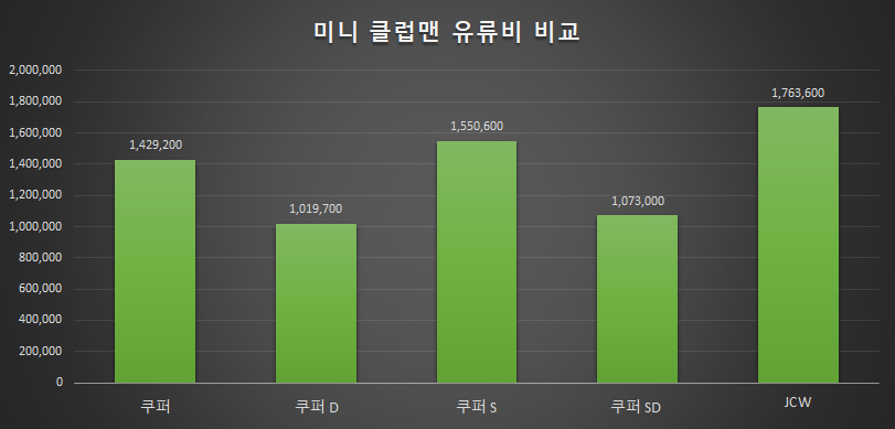 쿠퍼(가솔린)과 쿠퍼D(디젤)의 출시가 차이는 약 3930 - 3580 = 340만원이다. 1년에 1만km를 운행한다면 위 그래프와 비슷하게 유류비가 나올 것이다. 쿠퍼와 쿠퍼D의 유류비차이는 약 40만원이다.