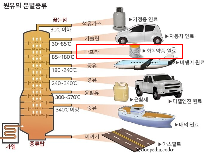 나프타는 석유화학 공업의 원료로 매우 중요하다. 나프타분해에 의해 생기는 에틸렌·프로필렌·부탄·부틸렌 유분·방향족 등에서 많은 석유화학 반응을 거쳐 합성수지·합성고무·합성섬유 등이 제조된다