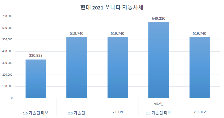 현대자동차 쏘나타에는 크게 2종류의 모델이 있다. (N Line은 배기량이 같으므로 제외)