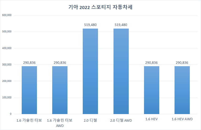 | 스포티지 | 1.6 가솔린 터보 | 1.6 가솔린 터보 AWD | 2.0 디젤 | 2.0 디젤 AWD | 1.6 HEV | 1.6 HEV AWD |