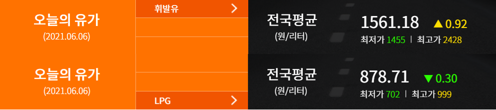 | 2021년 6월 6일 기준 리터당 연료 가격(한국석유공사 오피넷 기준, 소수자리는 절사) | |