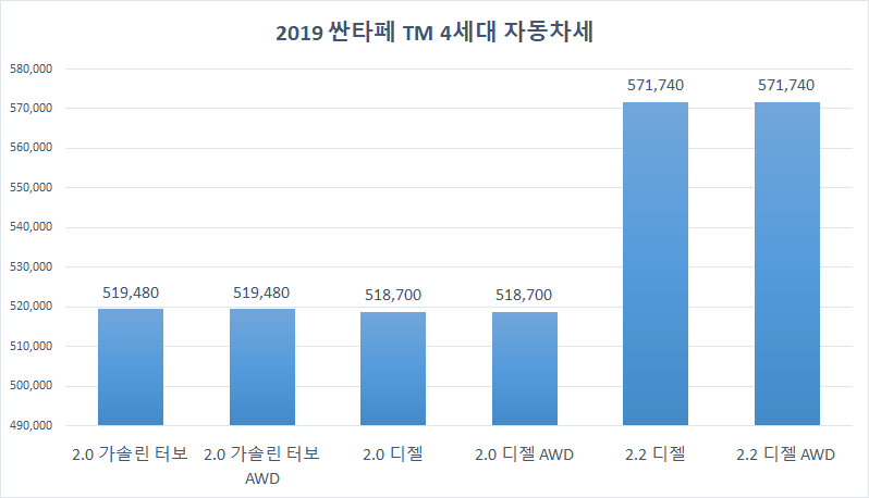 | 싼타페 TM | 2.0 가솔린 터보 | 2.0 가솔린 터보 AWD | 2.0 디젤 | 2.0 디젤 AWD | 2.2 디젤 | 2.2 디젤 AWD |