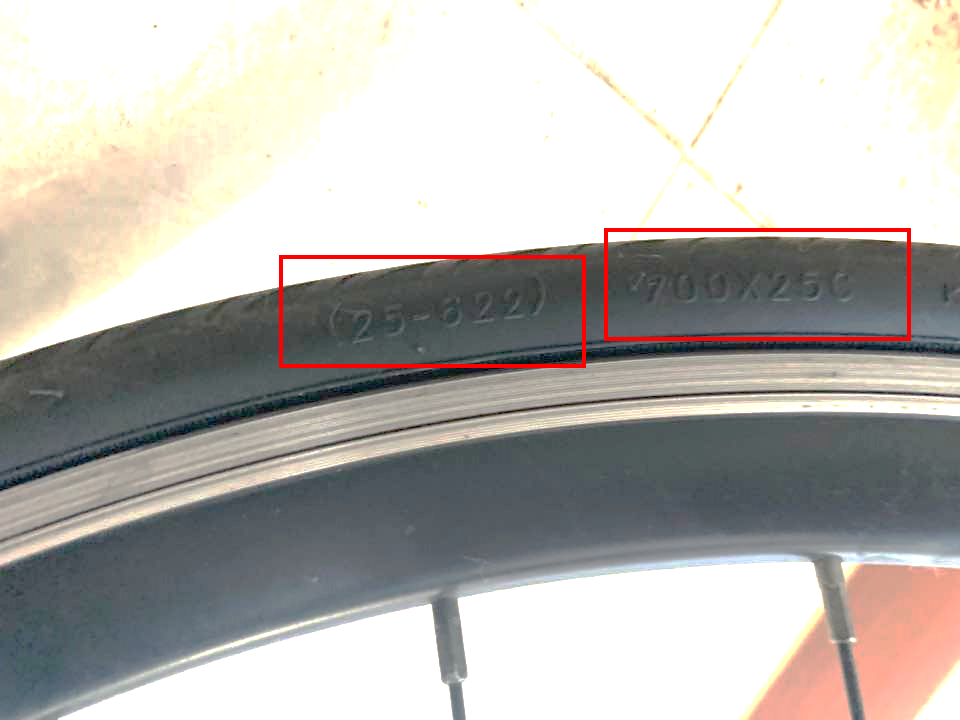 위 사진에서는 25-622이므로 25mm의 타이어 두께와 622mm의 타이어 안지름을 가진 타이어를 뜻합니다.
