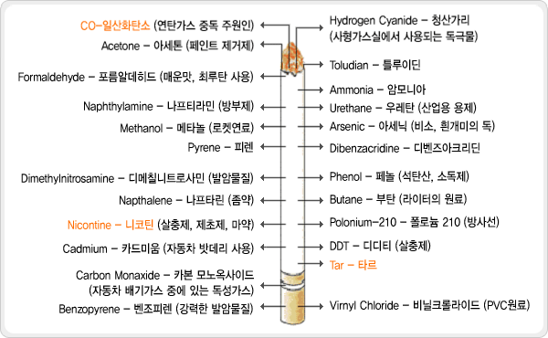 담배에는 위 사진에서 알 수 있듯 여러 화학물질들이 들어있습니다.