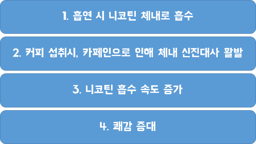 담배를 피면 체내로 니코틴이 흡수됩니다. 이때 커피를 통해 카페인을 섭취하면 신진대사가 활발해집니다. 활발해진 신진대사 덕분에 체내에 흡수된 니코틴이 좀 더 우리 몸을 빨리 순환하게 됩니다. 즉, 니코틴 흡수가 더욱 빨라지는 것이죠.