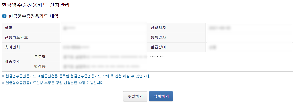 조회/발급 - 현금영수증 - 현금영수증 발급수단 - 현금영수증전용카드신청