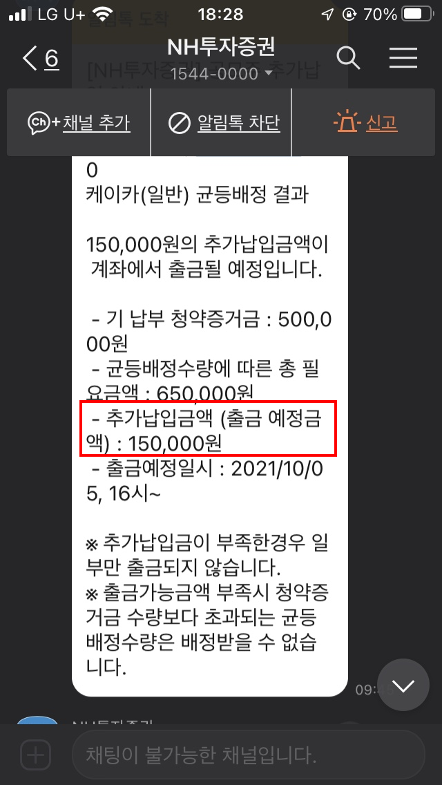 주제로 돌아와서 위 사진처럼 균등 혹은 비례 배분으로 내가 입금한 증거금 이상으로 주식이 배정되면 그 가격 차이만큼 추가 입금이 필요합니다. 여기서 만약 입금하지 않으면 추가 배정된 주식은 받지 못하게 되고 다른 사람에게 돌아가게 됩니다.