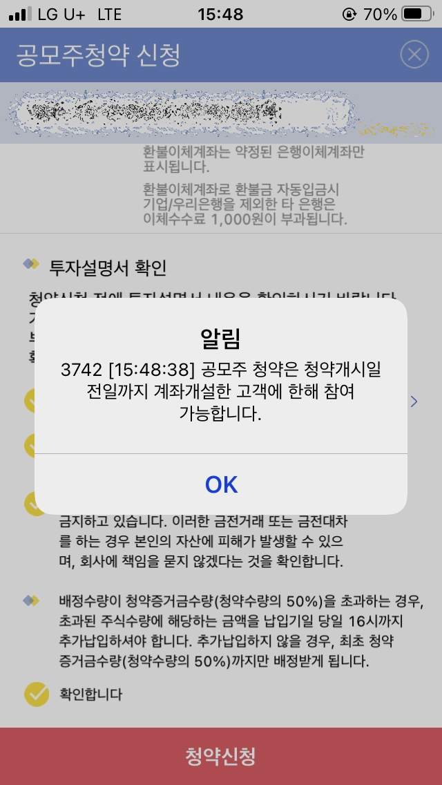 미래에셋증권의 경우 청약 마감일에도 비대면으로 계좌를 개설하면 공모주 청약이 가능하다고 합니다. 본인이 공모주 청약하려는 증권사의 규정을 꼭 확인해보시길 바랍니다. 부디 저같은 피해자가 없기를..