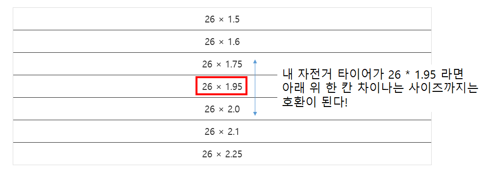 자전거 타이어의 둘레를 뜻하는 26은 반드시 일치해야 하지만, 1.95는 조금 달라도 큰 상관 없습니다.