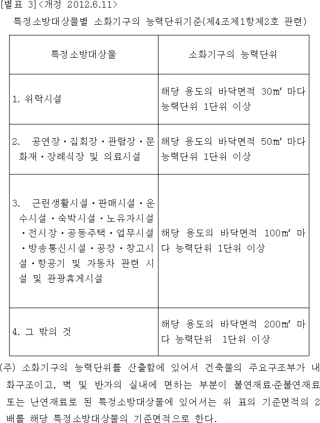 특정소방대상물에 따라 소화기구의 능력단위는 별표 3의 기준에 따를 것