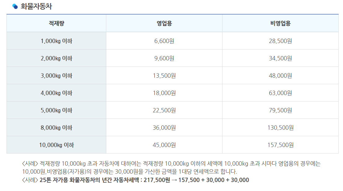 화물차 세금표에 의하면 우리가 알고 있는 대부분의 1톤 트럭은 영업용의 경우 1년에 6,600원만 납부하면 됩니다. 비영업용의 경우는 28,500원입니다.