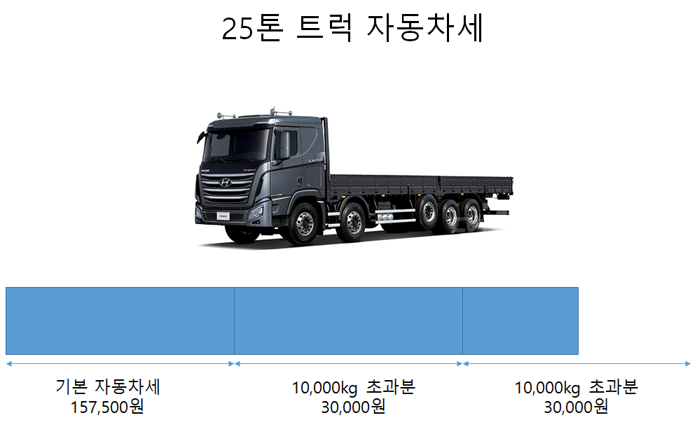 25,000kg의 경우 10,000kg을 초과합니다. 10,000kg 즉 10톤 이상의 화물차는 10톤을 초과할때 마다 가산금액이 붙습니다.