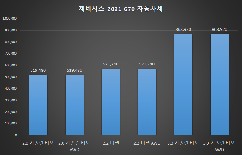 2.0 가솔린 터보 모델이 가장 자동차세가 저렴하고, 3.3 가솔린 터보 모델이 자동차세가 가장 비쌉니다.
