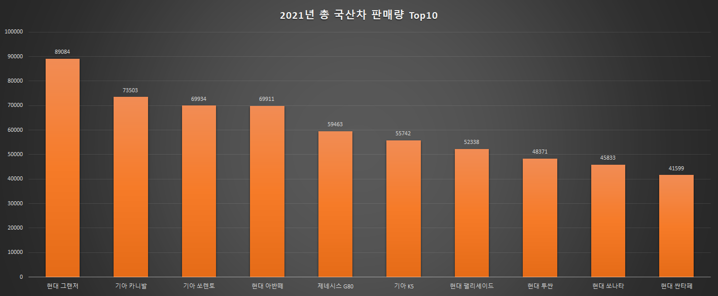 2021년을 결산하는 의미에서 2021년 총 국산차 판매량 top10을 알아볼까 합니다.