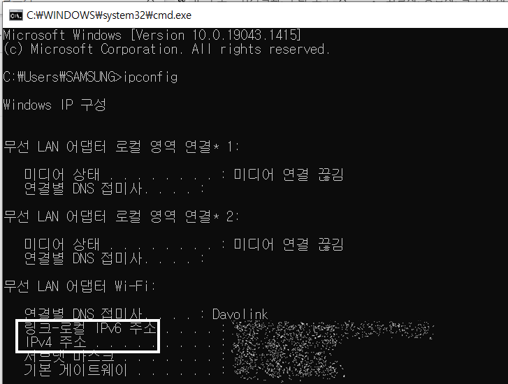 그러면 위 사진과 같이 IPv6, IPv4 주소가 나타납니다. 저는 개인정보를 위해 가려놓았습니다.