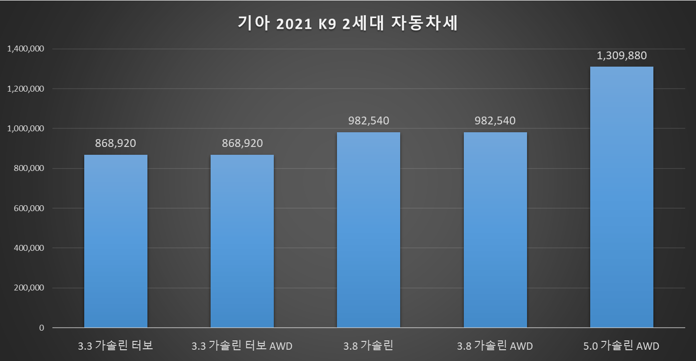 | 2021 기아 K9 | 3.3 가솔린 터보 | 3.3 가솔린 터보 AWD | 3.8 가솔린 | 3.8 가솔린 AWD | 5.0 가솔린 AWD |