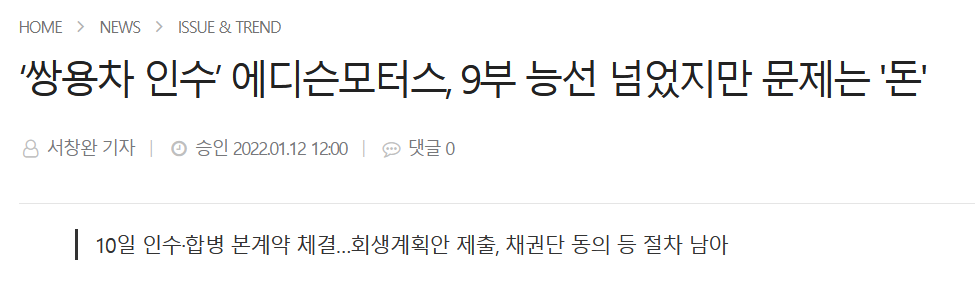 현재 거의 에디슨 모터스에서 인수할 것으로 보이지만 확정된 사항은 아니기에, 만약 인수 합병에 실패한다면 쌍용자동차는 역사속으로 사라지게 될지도 모르겠습니다. 대우자동차처럼요.