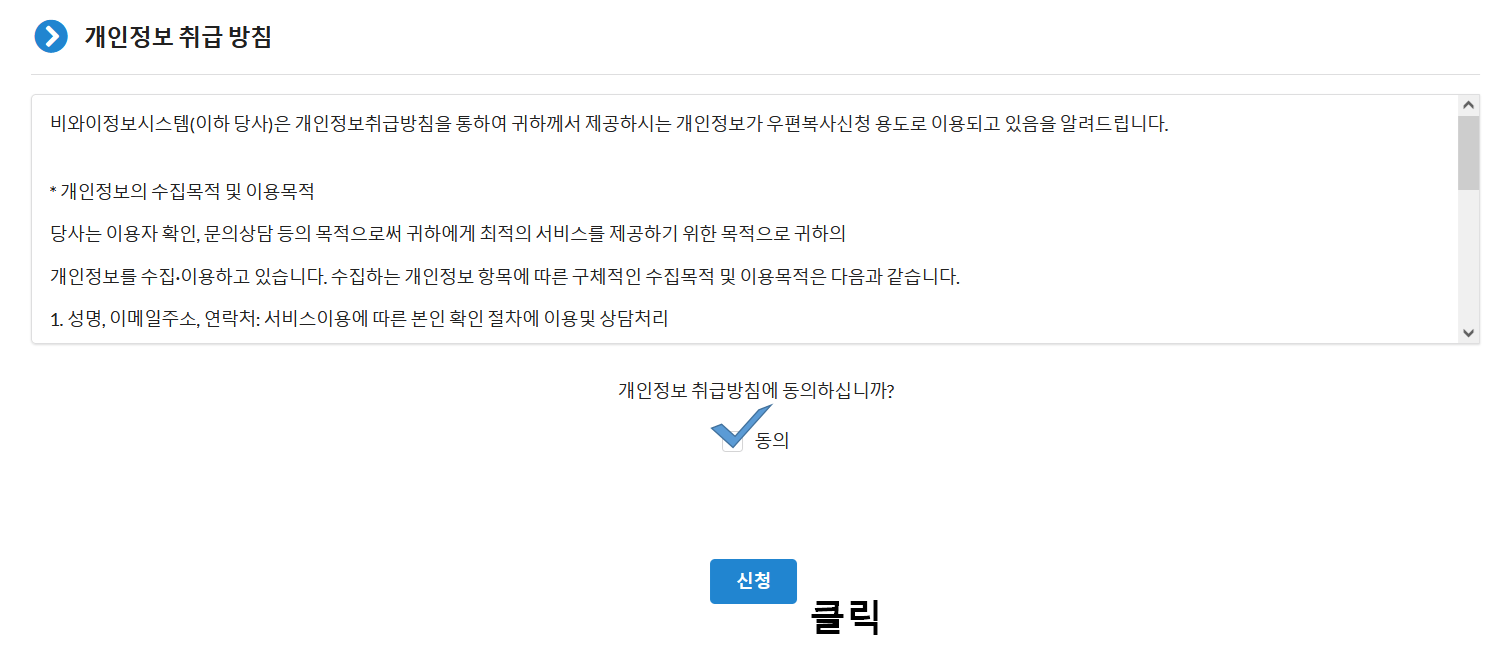 5. 개인정보 취급 방침 동의 후 신청하기를 클릭합니다.