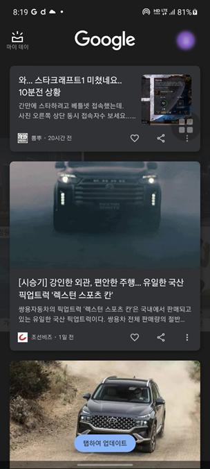 구글 디스커버는 위 사진처럼 뉴스기사가 주로 보입니다. 구글 디스커버는 구글 모바일에 새로 도입된 인공지능 광고입니다.