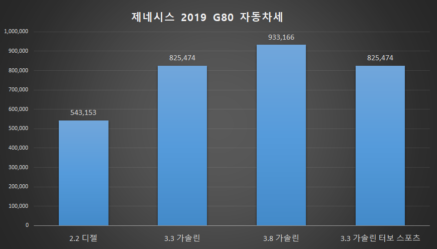 | 제네시스 2019 G80 | 2.2 디젤 | 3.3 가솔린 | 3.8 가솔린 | 3.3 가솔린 터보 스포츠 |