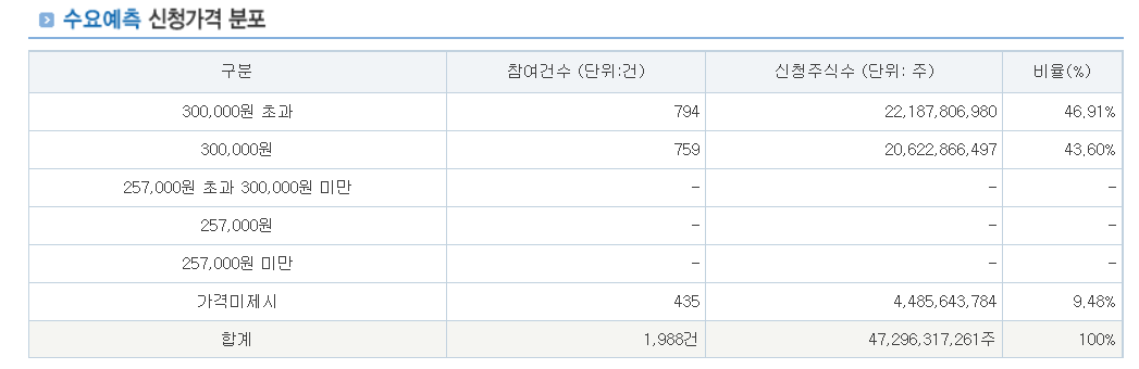 257,000 ~ 300,000원입니다. 나중에 청약할 때 가격은 기관들의 경쟁에 의해서 결정되는데요. LG에너지솔루션은 300,000원으로 확정되었습니다. 이게 무엇을 뜻할까요?