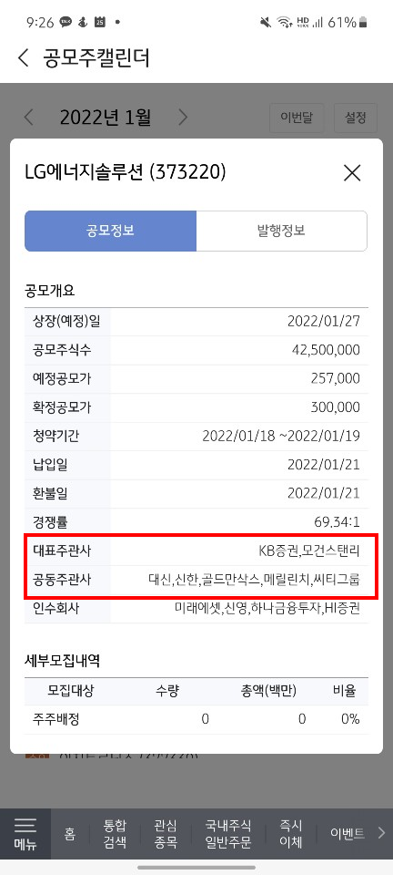 KB증권에서 LG에너지솔루션 공모주를 찾아보면 대표주관사, 공동주관사라고 되어 있습니다.